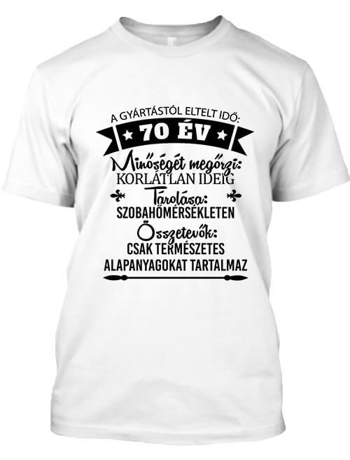 70 éves születésnap – Férfi póló. Férfi környakas rövid ujjú póló. Kényelmes viselet, bársonyos, selymes tapintású. Anyaga 100% fésült pamut, a szürke színű póló 85% fésült pamut és 15% viszkóz 190g/m2 anyagvastagságú, tartós anyag. FIGYELEM! Rendelés előtt mindenképp ellenőrizd a mérettáblázatot, mert gyártónként eltérhetnek a méretek. A 100% pamut póló mosás után minimálisan összemehet. A mérettáblázatot alul találod. 70 éves születésnap – Férfi póló születésnaposoknak, 70 éves szülinaposoknak. Póló nyomtatás, póló tervezés a Pólóplanet webáruház oldalán.