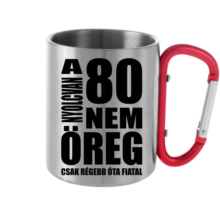 A 80 nem öreg Születésnap – Karabineres bögre. A klasszikus bögre modern verziója. Kétrétegű, szürke fém bögre, kampózáras füllel, 3dl-es méretben. Praktikus és még jól is néz ki! A karabiner segítségével könnyen rácsatolhatod a nadrágodra vagy táskádra fesztiválon, túrázáskor vagy akár a hétköznapokban, így mindig kéznél lesz és nem hagyod el. Színtartása és kopásállósága hosszan tartó. A nyomat szublimációs eljárással kerül a bögrére. Mi is teszteltük és ez jött be a legjobban. Nézd meg és fedezd fel több 1000 termékünket is az alábbi linkre kattintva! A 80 nem öreg Születésnap – Karabineres bögre 80 éves szülinaposoknak. Egyedi ajándékok, bögre nyomtatás a Pólóplanet webáruház oldalán.