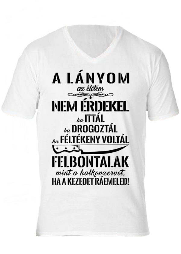 A lányom az életem . Férfi V nyakú rövid ujjú póló. Kényelmes viselet, bársonyos tapintású. Anyaga 100% gyűrűs fonású pamut, 185g/m2 , a fehér színű 180g/m2 anyagvastagságú, tartós anyag. FIGYELEM! Rendelés előtt mindenképp ellenőrizd a mérettáblázatot, mert gyártónként eltérhetnek a méretek! A 100% pamut póló mosás után minimálisan összemehet. A mérettáblázatot alul találod. A lányom az életem – Férfi V nyakú póló büszke apáknak. Egyedi ajándékok, pólóra nyomtatás a Pólóplanet webáruház oldalán.