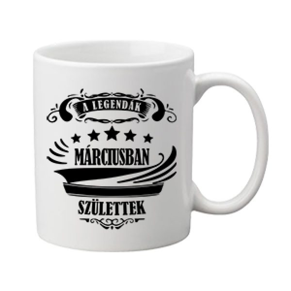 A legendák márciusban születtek – Bögre. Klasszikus extra fényes fehér bögre 3dl-es méretben. Mikrózható és mosogatógépben mosogatható. Hosszan tartó színtartás és kopásállóság. A legendák márciusban születtek – Bögre márciusi születésnaposoknak. Egyedi ajándékok, pólóra nyomtatás a Pólóplanet webáruház oldalán.