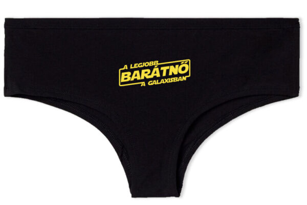 A legjobb barátnő a galaxisban – Francia bugyi. A bugyi francia szabású és szexi. Kényelmes viseletet biztosít, selymes tapintású. Anyaga 95% pamut és 5% elasztán. Ajándéknak is kiváló. Ünnepnapokon és hétköznapokban is hordhatod. A nyomat digitális nyomtatással (DTG technológia) készül közvetlen a bugyi anyagába ezáltal tartós élénk nyomatot biztosít. Nézd meg a többi termékünket is az alábbi linkre kattintva. A legjobb barátnő a galaxisban – Francia bugyi a legjobb barátnődnek vagy a csajodnak. Fehérnemű, bugyi, boxer a Pólóplanet webáruház oldalán.