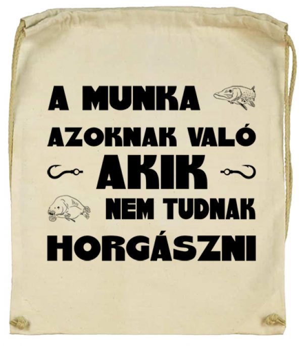 A munka azoknak való horgászat – Basic tornazsák. A tornazsák vagy hátizsák kényelmes és praktikus kiegészítő a mindennapokban. 140 g/m2 anyagvastagságú, 100% pamutvászon, összehúzható hordozópánttal, megerősített pántnyílással és hímzett fűzőlyukkal. Rendkívül erős, strapabíró anyag. Nagy igénybevételnek is kitehető. A munka azoknak való horgászat – Basic tornazsák pecásoknak. Póló tervezés, pólóra nyomtatás a Pólóplanet webáruház oldalán.