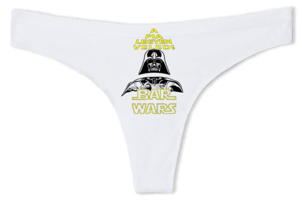 Bar Wars – Tanga. A tanga bugyi szexi és kényelmes ráadásul selymes tapintású fehérnemű. Anyaga 95% pamut és 5% elasztán. Bar Wars – Tanga alsónemű Star wars rajongóknak viccesen. Fehérnemű nyomtatás, bugyi nyomtatás a Pólóplanet webáruház oldalán.
