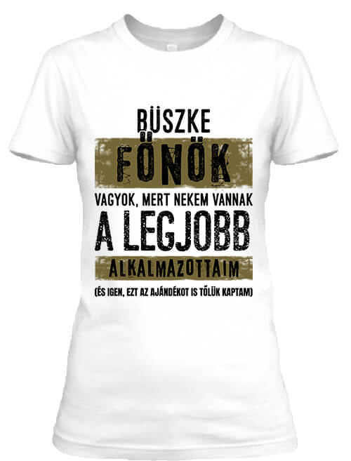 Büszke főnök – Női póló. Női környakas rövid ujjú póló. Kényelmes viselet, bársonyos, selymes tapintású. Anyaga 100% fésült pamut, a hamuszürke színű póló 98% fésült pamut és 2% viszkóz 190g/m2 anyagvastagságú, tartós anyag. FIGYELEM! Rendelés előtt mindenképp ellenőrizd a mérettáblázatot, mert gyártónként eltérhetnek a méretek. A 100% pamut póló mosás után minimálisan összemehet. A mérettáblázatot alul találod. Büszke főnök – Női póló a legkirályabb főnököknek, vezetőknek, managereknek. Póló nyomtatás, pólóra nyomtatás a Pólóplanet webáruház oldalán..