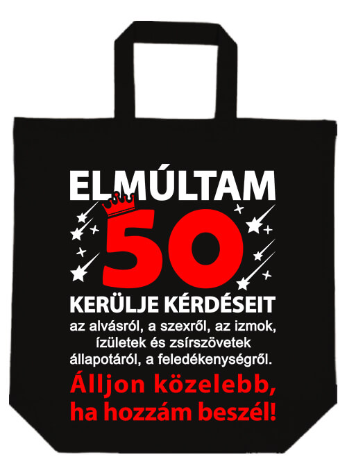 Ajándéknak vagy saját kiegészítőnek, Elmúltam 50 vászontáska mindig jó választás: a te stílusodra szabva, strapabíró, és a személyiségedről mesél. Tökéletes ajándék 50 éves születésnaposnak, szülinaposnak.