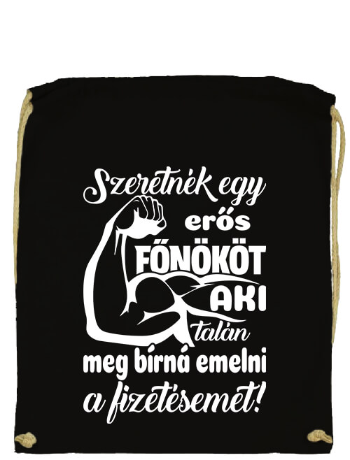 Erős főnök fizetésemeléssel – Basic tornazsák. A tornazsák vagy hátizsák kényelmes és praktikus kiegészítő a mindennapokban. 140 g/m2 anyagvastagságú, 100% pamutvászon, összehúzható hordozópánttal, megerősített pántnyílással és hímzett fűzőlyukkal. Rendkívül erős, strapabíró anyag. Nagy igénybevételnek is kitehető. Erős főnök fizetésemeléssel – Basic tornazsák főnöködnek, vezetődnek bármilyen alkalomra. Egyedi nyomtatás, tornazsák nyomtatás a Pólóplanet webshopjában.