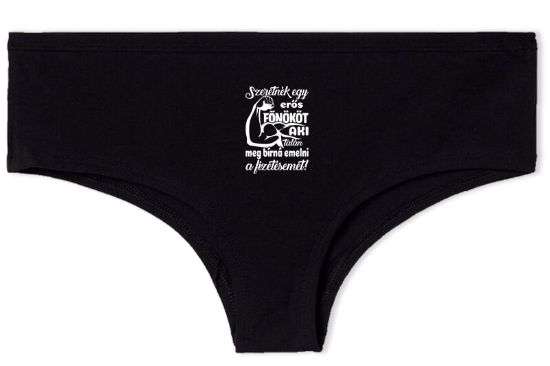 Erős főnök fizetésemeléssel – Francia bugyi. A bugyi francia szabású és szexi. Kényelmes viseletet biztosít, selymes tapintású. Anyaga 95% pamut és 5% elasztán. Ajándéknak is kiváló. Ünnepnapokon és hétköznapokban is hordhatod. A nyomat digitális nyomtatással (DTG technológia) készül közvetlen a bugyi anyagába ezáltal tartós élénk nyomatot biztosít. Nézd meg a többi termékünket is az alábbi linkre kattintva. Erős főnök fizetésemeléssel – Francia bugyi főnöködnek, vezetődnek bármilyen alkalomra. Fehérnemű, bugyi, boxer a Pólóplanet webáruház oldalán.