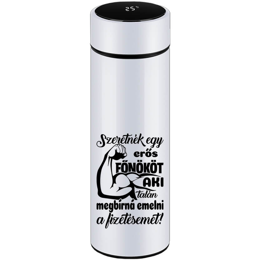 Erős főnök fizetésemeléssel – Okos kulacs. Dupla falú, fehér színű termosz digitális hőkijelzővel, mely jelzi a kulacsban a folyadék hőmérsékletét, 500ml-es méretben. A hőmérséklet csak akkor jelenik meg, ha megérinted a kijelzőt, majd pár másodperc után eltűnik. Tutira csepegésmentesen záródik! Nagyon menő, praktikus és még jól is néz ki! Tökéletes méretű kiránduláshoz, utazáshoz, sőt a suliba vagy munkába is ebben a menő kulacsban viheted hideg vagy meleg italodat. Hidegen tartja italod 24 órán és melegen tartja 12 órán keresztül. Kényelmesen elfér az iskolatáskában, női táskában, hátizsákban. Színtartása és kopásállósága kiváló. A nyomat szublimációs eljárással kerül a kulacsra. Mi is teszteltük és ez jött be a legjobban. Nézd meg és fedezd fel több 1000 termékünket is az alábbi linkre kattintva! Erős főnök fizetésemeléssel – Intelligens kulacs főnöködnek, vezetődnek bármilyen alkalomra. Egyedi ajándékok, póló nyomtatás a Pólóplanet webáruház oldalán.