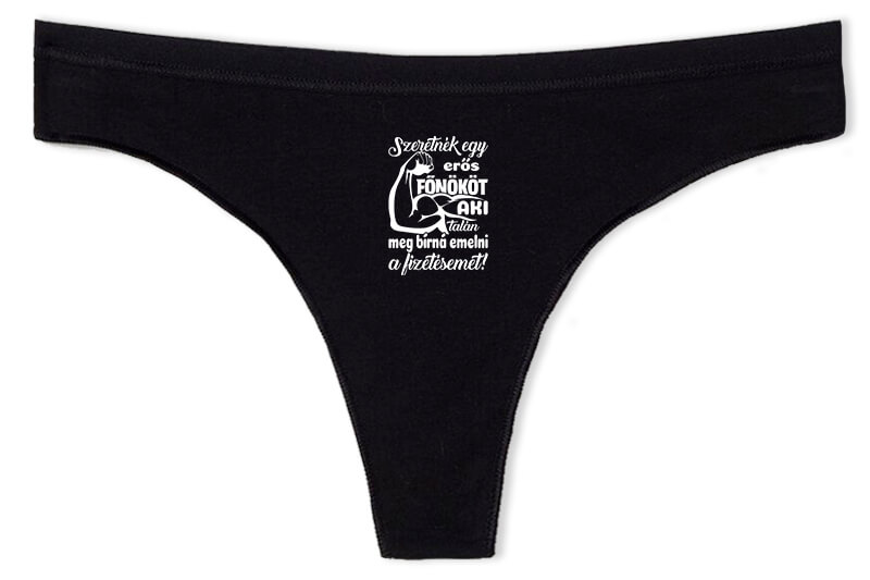 Erős főnök fizetésemeléssel – Tanga. A tanga bugyi szexi, de mégis kényelmes , ráadásul selymes tapintású. Anyaga 95% pamut és 5% elasztán. Ajándéknak is kiváló. Ünnepnapokon és hétköznapokban is hordható. A nyomat digitális nyomtatással (DTG technológia) készül közvetlen a bugyi anyagába ezáltal tartós élénk nyomatot biztosít. Nézd meg a többi termékünket is az alábbi linkre kattintva. Erős főnök fizetésemeléssel – Tanga női alsónemű főnöködnek, vezetődnek bármilyen alkalomra. Fehérnemű, bugyi, boxer a Pólóplanet webáruház oldalán.