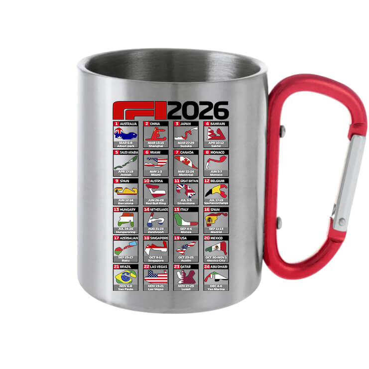 Forma 1 2026 versenynaptár – Karabineres bögre. A klasszikus bögre modern verziója. Kétrétegű szürke fém bögre karabineres, kampózáras füllel, 3dl-es méretben. Praktikus és még jól is néz ki! Színtartása és kopásállósága kiváló. Forma 1 2026 versenynaptár – Karabineres bögre Forma 1 rajongóknak, versenyautó kedvelőknek, F1 fanoknak. Egyedi ajándékok, bögre nyomtatás a Pólóplanet webáruház oldalán.