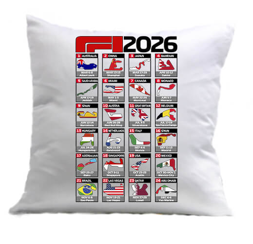 Forma 1 2026 versenynaptár – Párna. A párnahuzat selymes tapintású pihe-puha, tartós, fényes, szatén anyag. A huzat anyagvastagsága 165g/m2. A párnahuzat cipzárral zárható. A párnahuzat és a párna mérete mérete 40 x 40 cm-es. Forma 1 2026 versenynaptár – Párna Forma 1 rajongóknak, versenyautó kedvelőknek, F1 fanoknak. Egyedi nyomtatás, párna nyomtatás a Pólóplanet webshopjában.