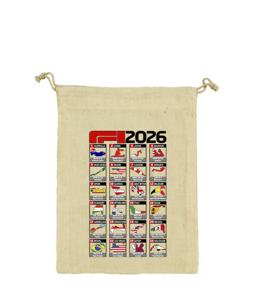 Forma 1 2026 versenynaptár – egyedi, nyomtatott vászonzacskó nemcsak hasznos, hanem különleges ajándék is Forma 1 rajongóknak, versenyautó kedvelőknek, F1 fanoknak.