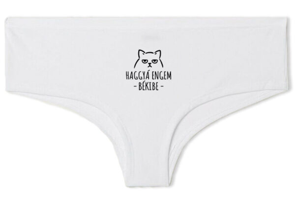 Haggyá engem békibe – Francia bugyi. A bugyi francia szabású és szexi. Kényelmes viseletet biztosít, selymes tapintású. Anyaga 95% pamut és 5% elasztán. Ajándéknak is kiváló. Ünnepnapokon és hétköznapokban is hordhatod. A nyomat digitális nyomtatással (DTG technológia) készül közvetlen a bugyi anyagába ezáltal tartós élénk nyomatot biztosít. Nézd meg a többi termékünket is az alábbi linkre kattintva. Haggyá engem békibe – Francia bugyi mindenkinek, neki is, neked is. Fehérnemű, bugyi, boxer a Pólóplanet webáruház oldalán.