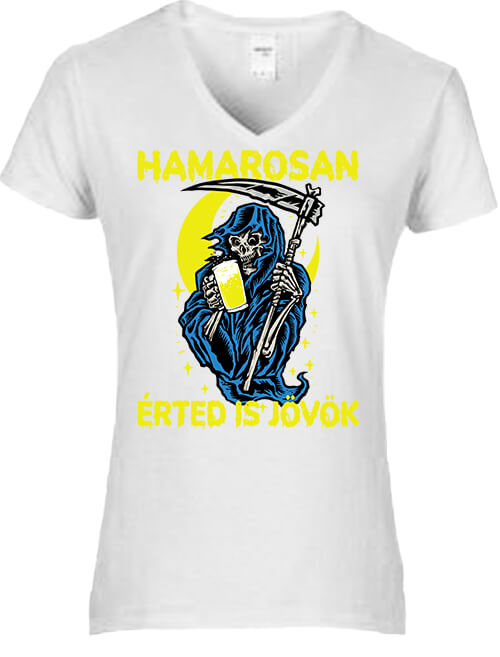 Hamarosan érted jövök Halloween – Női V nyakú póló . Női V nyakú rövid ujjú póló. Kényelmes viselet, bársonyos tapintású. Anyaga 100% gyűrűs fonású pamut, 185g/m2, a fehér színű 180g/m2 anyagvastagságú, tartós anyag. Testhez álló szabású. FIGYELEM! Rendelés előtt mindenképp ellenőrizd a mérettáblázatot, mert gyártónként eltérhetnek a méretek! A 100% pamut póló mosás után minimálisan összemehet. A mérettáblázatot alul találod. Hamarosan érted jövök Halloween – Női V nyakú póló mindenkinek Halloweenra. Egyedi ajándékok, pólóra nyomtatás a Pólóplanet webáruház oldalán.
