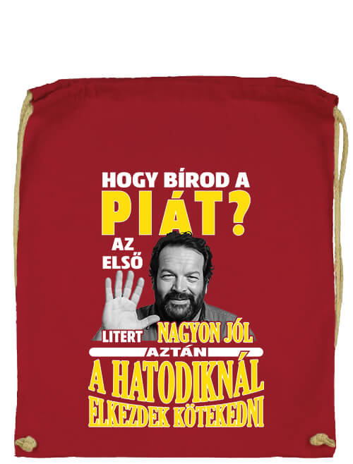 Hogy bírod a piát Bud Spencer – Prémium tornazsák. A tornazsák vagy hátizsák kényelmes és praktikus viselet a mindennapokban. 310 g/m2 anyagvastagságú, 100% pamutvászon, összehúzható hordozópánttal, megerősített pántnyílással és hímzett fűzőlyukkal. Rendkívül erős, strapabíró anyag. Bármilyen nagy igénybevételnek is kitehető. Hogy bírod a piát Bud Spencer – Prémium tornazsák piabajnok haveroknak, kocsmaharcosoknak, másnapos hősöknek. Egyedi nyomtatás, tornazsák nyomás a Pólóplanet webshopjában.
