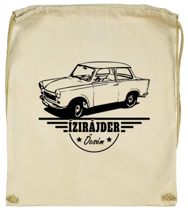Ízirájder öcsém Trabant – Basic tornazsák. A tornazsák vagy hátizsák kényelmes és praktikus kiegészítő a mindennapokban. 140 g/m2 anyagvastagságú, 100% pamutvászon, összehúzható hordozópánttal, megerősített pántnyílással és hímzett fűzőlyukkal. Rendkívül erős, strapabíró anyag. Nagy igénybevételnek is kitehető. Ízirájder öcsém Trabant – Basic tornazsák humoros embereknek, trabantosoknak. Egyedi ajándékok, pólóra nyomtatás a Pólóplanet webáruház oldalán.