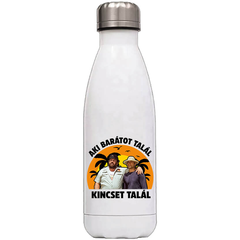 Jó barát kincs Bud Spencer – Klasszikus fém kulacs. Kétrétegű, fehér színű, szürke fém zárókupakkal, 500ml-es méretben. Praktikus és még jól is néz ki! A nyomat nagyon jó színtartó és kopásálló. A kulacsot teszteltük, és bármerre forgatjuk nem ereszti a tárolt folyadékot. Mi is ezt használjuk nap, mint nap. Jó barát kincs Bud Spencer – Kulacs legendás duóknak, a legjobb haverodnak, baráti köröknek. Egyedi ajándékok, póló tervezés a Pólóplanet webáruház oldalán.