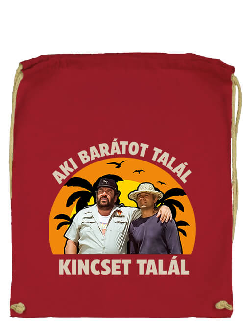 Jó barát kincs Bud Spencer – Prémium tornazsák. A tornazsák vagy hátizsák kényelmes és praktikus viselet a mindennapokban. 310 g/m2 anyagvastagságú, 100% pamutvászon, összehúzható hordozópánttal, megerősített pántnyílással és hímzett fűzőlyukkal. Rendkívül erős, strapabíró anyag. Bármilyen nagy igénybevételnek is kitehető. Jó barát kincs Bud Spencer – Prémium tornazsák legendás duóknak, a legjobb haverodnak, baráti köröknek. Egyedi nyomtatás, tornazsák nyomás a Pólóplanet webshopjában.