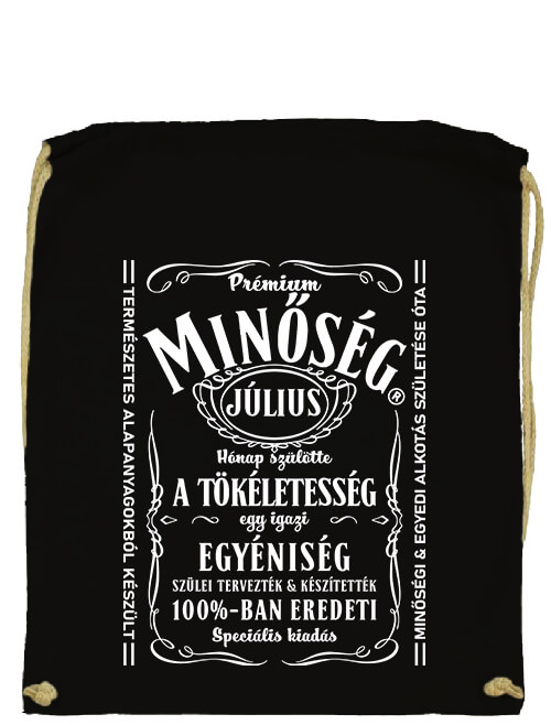 Júliusi születésnap – Prémium tornazsák. A tornazsák vagy hátizsák kényelmes és praktikus viselet a mindennapokban. 310 g/m2 anyagvastagságú, 100% pamutvászon, összehúzható hordozópánttal, megerősített pántnyílással és hímzett fűzőlyukkal. Rendkívül erős, strapabíró anyag. Bármilyen nagy igénybevételnek is kitehető. Júliusi születésnap – Prémium tornazsák júliusi szülinaposoknak. Egyedi nyomtatás, tornazsák nyomás a Pólóplanet webshopjában.