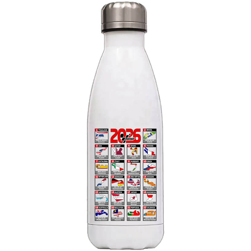 MotoGP 2026 versenynaptár – Klasszikus fém kulacs. Kétrétegű, fehér színű, szürke fém zárókupakkal, 500ml-es méretben. Praktikus és még jól is néz ki! A nyomat nagyon jó színtartó és kopásálló. A kulacsot teszteltük, és bármerre forgatjuk nem ereszti a tárolt folyadékot. Mi is ezt használjuk nap, mint nap. MotoGP 2026 versenynaptár – Kulacs MotoGP kedvelőknek, motor versenyek megszállottjainak. Egyedi ajándékok, póló tervezés a Pólóplanet webáruház oldalán.