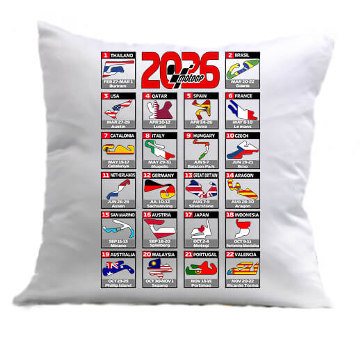 MotoGP 2026 versenynaptár – Párna. A párnahuzat selymes tapintású pihe-puha, tartós, fényes, szatén anyag. A huzat anyagvastagsága 165g/m2. A párnahuzat cipzárral zárható. A párnahuzat és a párna mérete mérete 40 x 40 cm-es. MotoGP 2026 versenynaptár – Párna MotoGP kedvelőknek, motor versenyek megszállottjainak. Egyedi nyomtatás, párna nyomtatás a Pólóplanet webshopjában.