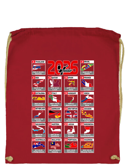 MotoGP 2026 versenynaptár – Prémium tornazsák. A tornazsák kényelmes és praktikus viselet a mindennapokban.  310 g/m2 anyagvastagságú, 100% pamutvászon, összehúzható hordozópánttal, megerősített pántnyílással és hímzett fűzőlyukkal. Rendkívül erős, strapabíró anyag. Bármilyen nagy igénybevételnek is kitehető. A nyomat digitális nyomtatással (DTG technológia) készül közvetlen a zsák anyagába ezáltal tartós élénk nyomatot biztosít. Mi is teszteltük és ez jött be a legjobban. Nézd meg és fedezd fel több 1000 termékünket is az alábbi linkre kattintva! MotoGP 2026 versenynaptár – Prémium tornazsák MotoGP kedvelőknek, motor versenyek megszállottjainak. Egyedi nyomtatás, tornazsák nyomás a Pólóplanet webshopjában.