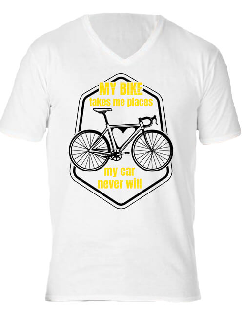 My bike takes me – Férfi V nyakú póló. Férfi V nyakú rövid ujjú póló. Kényelmes viselet, bársonyos tapintású. Anyaga 100% gyűrűs fonású pamut, 185g/m2, a fehér színű 180g/m2 anyagvastagságú, tartós anyag. FIGYELEM! Rendelés előtt mindenképp ellenőrizd a mérettáblázatot, mert gyártónként eltérhetnek a méretek. A 100% pamut póló mosás után minimálisan összemehet. A mérettáblázatot alul találod. My bike takes me – Férfi V nyakú póló bicósoknak, bringásoknak, kerékpárosoknak. Póló nyomtatás, póló tervezés a Pólóplanet webáruház oldalán.