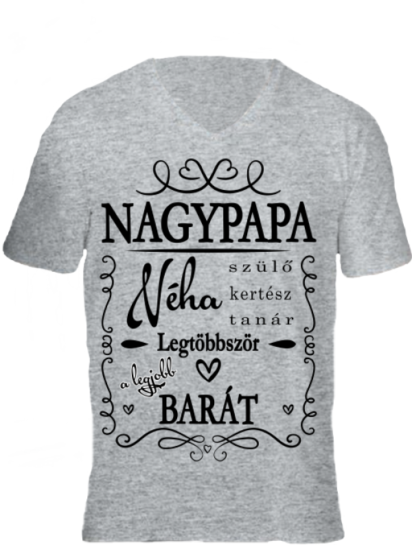 Nagypapa barát . Férfi V nyakú rövid ujjú póló. Kényelmes viselet, bársonyos tapintású. Anyaga 100% gyűrűs fonású pamut, 185g/m2 , a fehér színű 180g/m2 anyagvastagságú, tartós anyag. FIGYELEM! Rendelés előtt mindenképp ellenőrizd a mérettáblázatot, mert gyártónként eltérhetnek a méretek! A 100% pamut póló mosás után minimálisan összemehet. A mérettáblázatot alul találod. Nagypapa barát – Férfi V nyakú póló papának, barátnak, apának. Póló nyomtatás, pólóra nyomtatás a Pólóplanet webáruház oldalán.