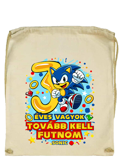 Sonic 3 éves születésnap – Basic tornazsák. A tornazsák vagy hátizsák kényelmes és praktikus kiegészítő a mindennapokban. 140 g/m2 anyagvastagságú, 100% pamutvászon, összehúzható hordozópánttal, megerősített pántnyílással és hímzett fűzőlyukkal. Rendkívül erős, strapabíró anyag. Nagy igénybevételnek is kitehető. Sonic 3 éves születésnap – Basic tornazsák Sonic rajongóknak, 3 éves szülinaposoknak. Egyedi nyomtatás, tornazsák nyomtatás a Pólóplanet webshopjában.