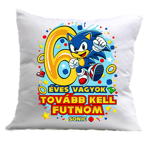 Sonic 6 éves születésnap – Párna. A párnahuzat selymes tapintású pihe-puha, tartós, fényes, szatén anyag. A huzat anyagvastagsága 165g/m2. A párnahuzat cipzárral zárható. A párnahuzat és a párna mérete mérete 40 x 40 cm-es. Sonic 6 éves születésnap – Párna Sonic rajongóknak, 6 éves szülinaposoknak. Egyedi nyomtatás, párna nyomtatás a Pólóplanet webshopjában.