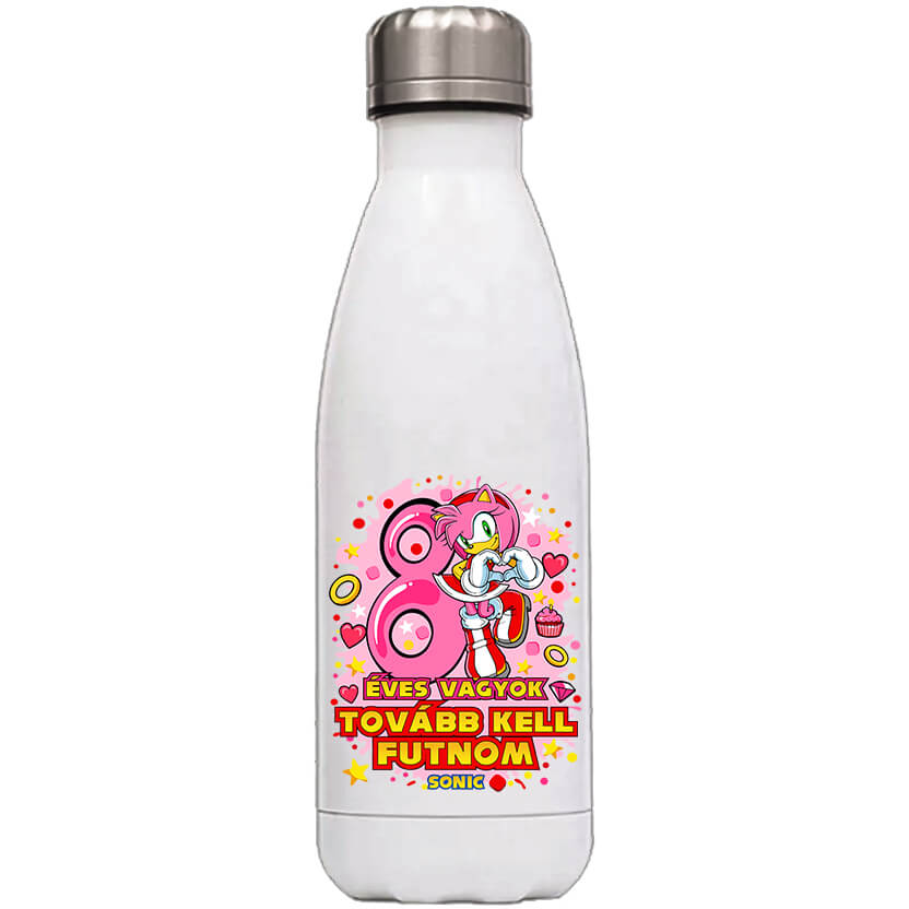 Sonic Amy 8 éves születésnap – Klasszikus fém kulacs. Kétrétegű, fehér színű, szürke fém zárókupakkal, 500ml-es méretben. Praktikus és még jól is néz ki! A nyomat nagyon jó színtartó és kopásálló. A kulacsot teszteltük, és bármerre forgatjuk nem ereszti a tárolt folyadékot. Mi is ezt használjuk nap, mint nap. Sonic Amy 8 éves születésnap – Kulacs Sonic Amy rajongóknak, 8 éves szülinaposoknak. Egyedi ajándékok, póló tervezés a Pólóplanet webáruház oldalán.