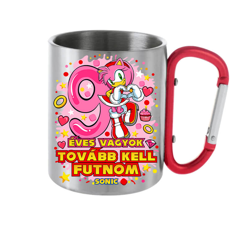 Sonic Amy 9 éves születésnap – Karabineres bögre. A klasszikus bögre modern verziója. Kétrétegű szürke fém bögre karabineres, kampózáras füllel, 3dl-es méretben. Praktikus és még jól is néz ki! Színtartása és kopásállósága kiváló. Sonic Amy 9 éves születésnap – Karabineres bögre Sonic Amy rajongóknak, 9 éves szülinaposoknak. Egyedi ajándékok, bögre nyomtatás a Pólóplanet webáruház oldalán.