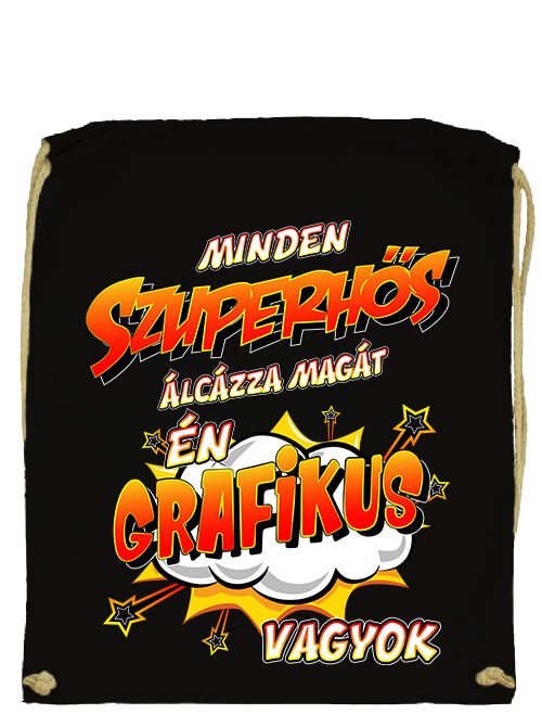 Szuperhős grafikus – Prémium tornazsák. A tornazsák vagy hátizsák kényelmes és praktikus viselet a mindennapokban. 310 g/m2 anyagvastagságú, 100% pamutvászon, összehúzható hordozópánttal, megerősített pántnyílással és hímzett fűzőlyukkal. Rendkívül erős, strapabíró anyag. Bármilyen nagy igénybevételnek is kitehető.Szuperhős grafikus – Prémium tornazsák művészeknek, festőknek. Egyedi nyomtatás, tornazsák nyomás a Pólóplanet webshopjában.