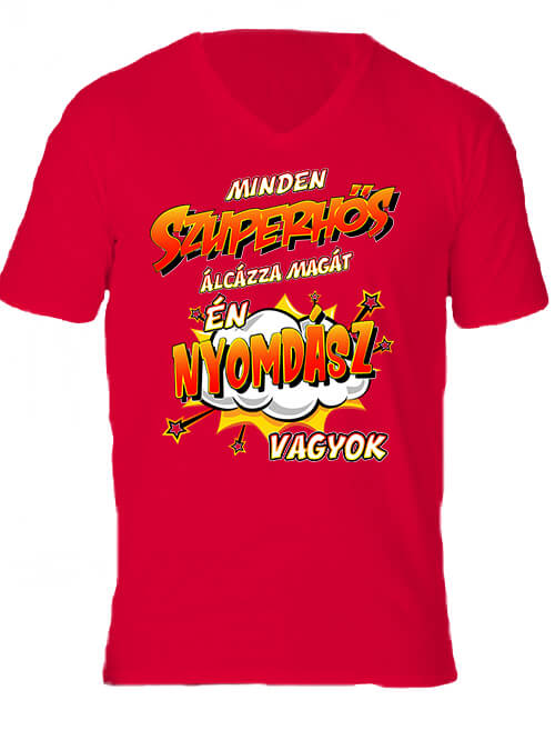 Szuperhős nyomdász – Férfi V nyakú póló . Férfi V nyakú rövid ujjú póló. Kényelmes viselet, bársonyos tapintású. Anyaga 100% gyűrűs fonású pamut, 185g/m2 , a fehér színű 180g/m2 anyagvastagságú, tartós anyag. FIGYELEM! Rendelés előtt mindenképp ellenőrizd a mérettáblázatot, mert gyártónként eltérhetnek a méretek. A 100% pamut póló mosás után minimálisan összemehet. A mérettáblázatot alul találod. Szuperhős nyomdász – Férfi V nyakú póló kiváló gépmestereknek, nyomdai dolgozóknak. Egyedi nyomtatás, póló nyomás a Pólóplanet webshopjában.