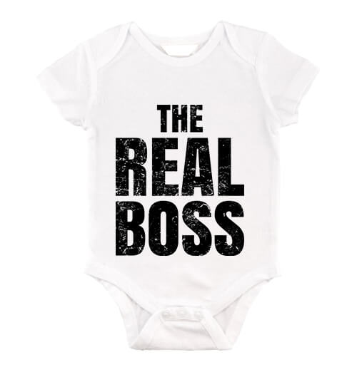 The real boss igazi főnök – Baby body. Kényelmes viseletet biztosít a babának egész évben. Anyaga 100% pamut, tartós anyag. Egy egyedi kombidressz készíttetése vagy kiválasztása személyes és különleges ajándék lehet egy kisbabának és a családjának, amely a mindennapokat stílusossá varázsolja és később emlék maradhat a cseperedő babának. The real boss igazi főnök – Baby body az igazi főnököknek0