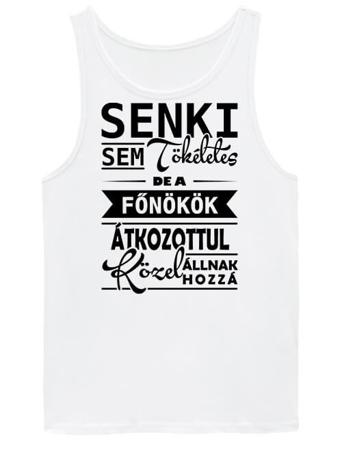 Tökéletes főnökök – Férfi ujjatlan póló, trikó. Kényelmes viselet, bársonyos, selymes tapintású. Anyaga 100% fésült pamut, a szürke színű atléta 85% fésült pamut és 15% viszkóz, 150g/m2 anyagvastagságú, tartós anyag. Sok színből válogathatsz. Testhezálló szabású, körkötött fazon, bordás, elasztikus nyakpasszé, szalagerősített nyakvonal. Ha jobban szereted a bővebb viseletet, rendelj egy-két számmal nagyobbat! A nyomat digitális nyomtatással (DTG technológia) készül közvetlen a póló anyagába, ezáltal tartós, élénk nyomatot biztosít. Mi is teszteltük és ez jött be a legjobban. FIGYELEM! Rendelés előtt mindenképp ellenőrizd a mérettáblázatot, mert gyártónként eltérhetnek a méretek! A 100% pamut, ujjatlan póló mosás után minimálisan összemehet. Nézd meg a többi termékünket is az alábbi linkre kattintva! Tökéletes főnökök – Férfi ujjatlan póló tökéletes menedzsereknek és vezetőknek. Póló nyomtatás, póló tervezés a Pólóplanet webáruház oldalán.