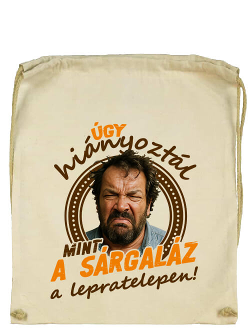 Úgy hiányoztál Bud Spencer – Basic tornazsák. A tornazsák kényelmes és praktikus kiegészítő a mindennapokban. 140 g/m2 anyagvastagságú, 100% pamutvászon, összehúzható hordozópánttal, megerősített pántnyílással és hímzett fűzőlyukkal. Rendkívül erős, strapabíró anyag. Nagy igénybevételnek is kitehető. A nyomat digitális nyomtatással (DTG technológia) készül közvetlen a hátizsák anyagába ezáltal tartós élénk nyomatot biztosít. Mi is teszteltük és ez jött be a legjobban. Nézd meg és fedezd fel több 1000 termékünket is az alábbi linkre kattintva! Úgy hiányoztál Bud Spencer – Basic tornazsák bulis napokra, legendás dumák híveinek, a legjobb arcoknak. Egyedi nyomtatás, tornazsák nyomtatás a Pólóplanet webshopjában.