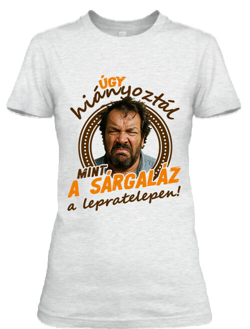 Úgy hiányoztál Bud Spencer – Női póló. Klasszikus szabású, szűkített fazonú, rövid ujjú póló. Kényelmes viselet, anyaga 100% fésült pamut, a hamuszürke színű póló 98% fésült pamut és 2% viszkóz 190g/m2 anyagvastagságú, tartós anyag. FIGYELEM! Rendelés előtt mindenképp ellenőrizd a mérettáblázatot, mert gyártónként eltérhetnek a méretek. A 100% pamut póló mosás után minimálisan összemehet. A mérettáblázatot alul találod. Úgy hiányoztál Bud Spencer – Női póló bulis napokra, legendás dumák híveinek, a legjobb arcoknak. Póló nyomtatás, pólóra nyomtatás a Pólóplanet webáruház oldalán..